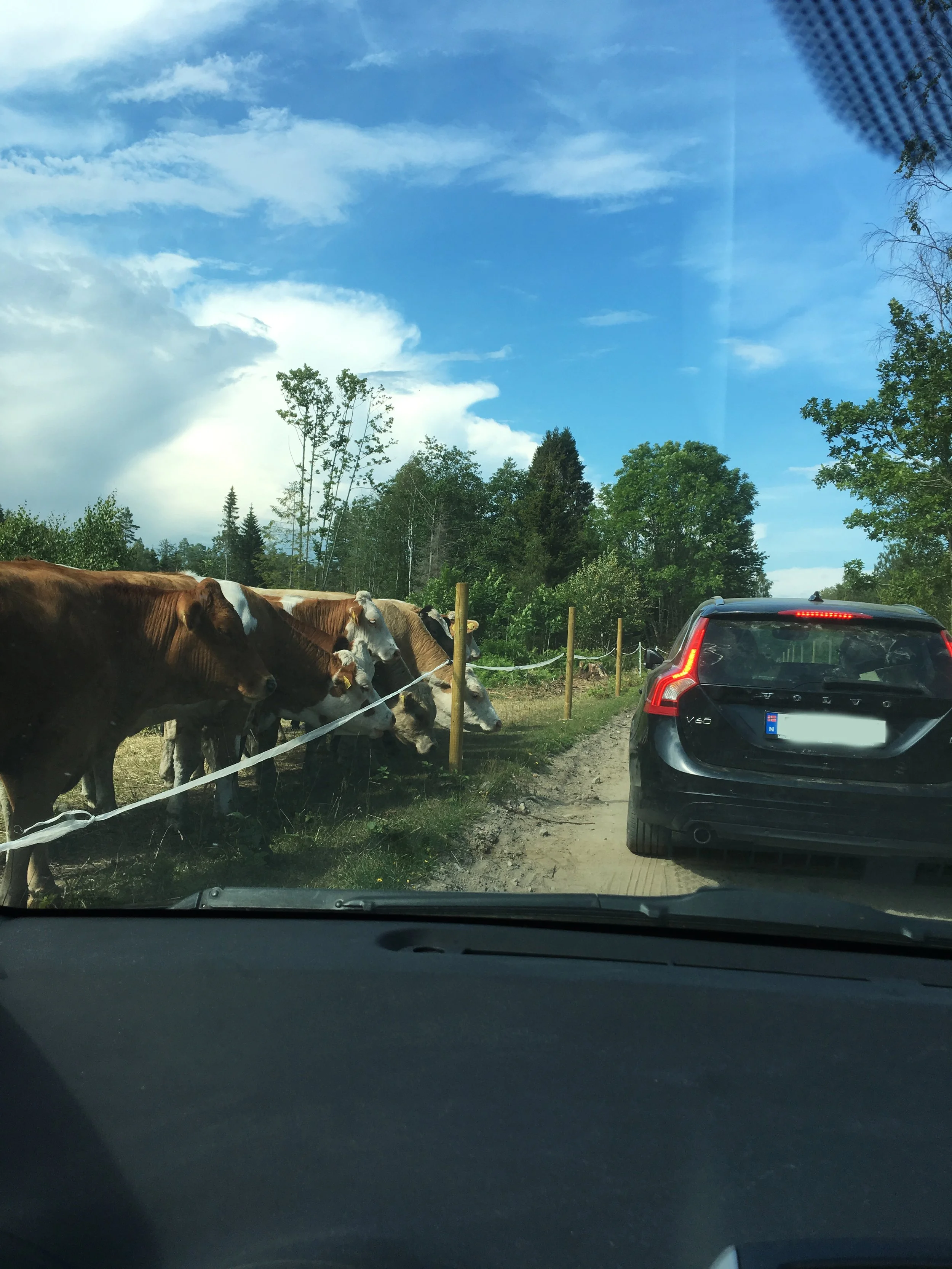 Da tiden kom og vi skulle forlate åstedet kom utfordringen med hvordan få bilene ut uten å slippe ut alle kyra. Det ble ikke så lett som forventet og krevde stor innsats fra alle mann. Brudeparet stod i den ene enden og prøvde å få oppmerksomheten til kyra, en forlover stod klar til å åpne og lukke grinda i en fei mens en og en bil fikk rygget seg ut før en ku skulle finne på å bli med. Det løste seg uten at vi slapp løs noen kyr på frifot.